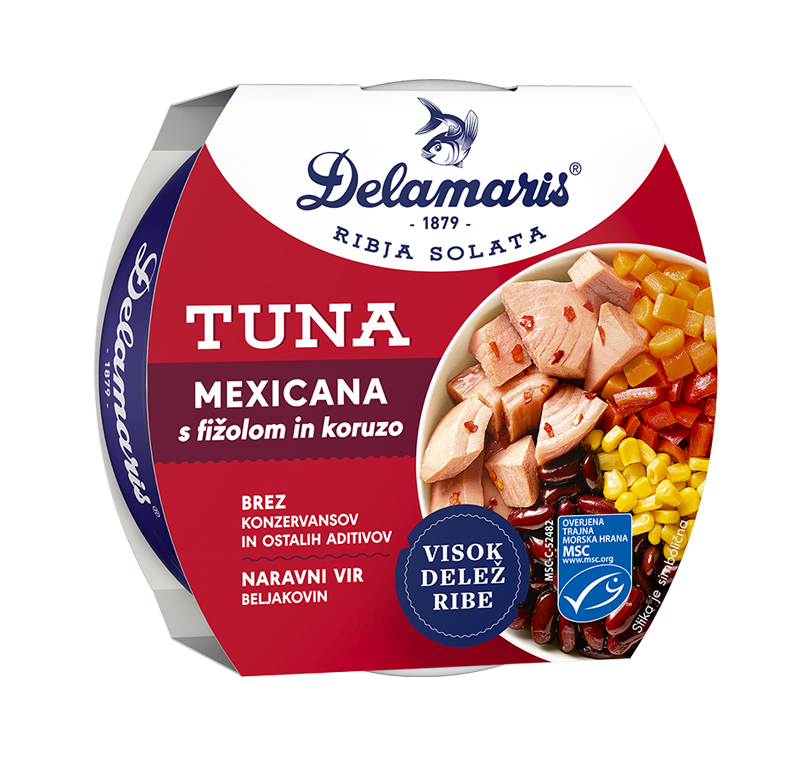 Delamaris tuna Mexicana oduševljava sve ljubitelje pikantnih ukusa. Osim odabranih komadića najbolje tune, ribljoj salati smo dodali crveni pasulj, kukuruz, crvenu papriku i šargarepu. Odlična je ideja za svaki dan – brza užina na poslu, putovanju ili kao praktičan međuobrok kod kuće.