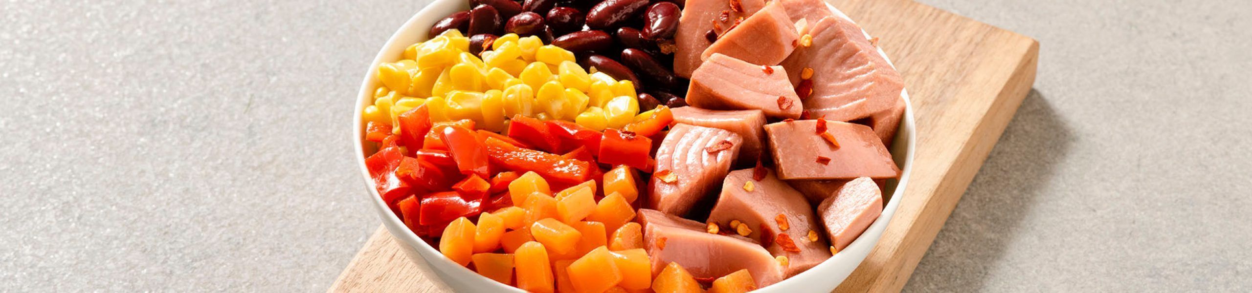 Sastojci: povrće sa promenljivim odnosom sastojaka 51,2 % (crveni pasulj, kukuruz, crvena paprika, šargarepa), tuna (Katsuwonus pelamis) 30 %, sos 18,8 % (voda, suncokretovo ulje, jodirana so, začini, šećer, krompirov skrob).